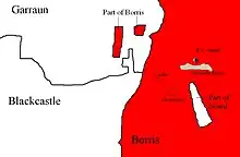 Borris townland also has two, very small, exclaves of its own. They lie just to the west of the village of Two-Miles Borris and are surrounded by Garraun townland.[6] The larger exclave has an area of just 1 acre 2 roods and 16 perches, while the smaller is only 3 roods and 26 perches in size. In the early 19th-century, the boundaries of these two exclaves were still almost completely reflected in the field boundaries of the time.[7] By the late 19th century much less of the boundaries were still reflected as field boundaries.[8] By the early 21st century, what little remained of the boundaries of these two exclaves formed part of the boundary of a field lying just to the north-east of the new housing area called Dún na Rí. The western edge of this field contained what remained of the eastern boundary of the larger exclave. The north-eastern corner of this field marked the north-eastern corner of the smaller exclave and short stretches of the edges meeting at this corner reflected the northern and eastern boundaries of the exclave.[9]