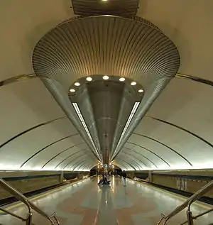 The vault is a white plastered solid shape with blue metallic stripes coming off into the walls. A long aluminium shape bisects its length. The walls are coated with brown marble and blue mosaic and the floor is a delicate pattern of red and grey granite. Lighting comes from the central aluminium shape and from hidden lamps behind the wall niches. Additional lighting comes from lampposts on the opposite ends of the platform. The vestibule ceiling is located on the same level as the vault apex making the appearance of a streamlined feature. The station has two vestibules on opposite sides of the Khrakivska Square these are interconnected with subways that have large glazed pavilions on the surface. For the first time in Metro's history, disabled access was given thought, and the station features lifts down to the platform level, wheelchair ramps and staircase angular rails.