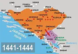 After the Ottoman conquest of Bosnian Kingdom, renamed as Herzegovina (transl. Herzog's land), until the conclusion of the Treaty of Karlowitz (1699), the Bosansko Primorje included two sub-regions, the southeastern between Dubrovnik and Herceg-Novi, and northwestern between Dubrovnik and Brštanik fort in the Neretva river delta near Neum-Klek. The northern part stretched from the mouth of the river Cetina to the mouth of the river Neretva, while the southern part included the coastal belt from the old parish of Dracevica to Risan, with Herceg-Novi as the most important place. Between those two parts of the coast is the territory of the Republic of Dubrovnik. During the First Morean War (1684-1699), the largest part of the Bosnia and Herzegovina coast was conquered by the Republic of Venice.[3] According to the provisions of the Treaty of Karlowitz from 1699, those areas were officially separated from the Herzegovinian Sanjak and joined to Venetian Dalmatia. After that, the Bosnia and Herzegovina coast was reduced to two very narrow strips: around Neum in the north and around Sutorina in the south.