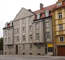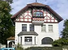The eastern end of Boschetsrieder Straße between the slope edge and the Maximiliansbahn was to be built with residential buildings for the workers of the industrial area. In anticipation, architect Robert Rehlen built a primary school in 1903/04 in a compact Art Nouveau style on a largely open field.[5] In accordance with the pedagogical and social concept of the Georg Kerschensteiner municipal school council, the school was equipped with classrooms, rooms for technical training and facilities for the entire neighbourhood. Therefore, children's bath, a children's home and a social centre were integrated into the school building. Together with the school, Rehlen also built the neighbouring fire station.