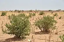 B. senegalensis can benefit farmers because it keeps soil from laying bare and thus prevents soil erosion and degradation. It also buffers against wind, stabilizes sand dunes, offers shade to surrounding plants and cycles nutrients.[3] In Niger, the trees are often cut or burned down by farmers in the dry season, in order to make space on the field for staple crops such as millet or sorghum. However, due to the strong surviving character of the tree, it reappears after the first rains and continues growing as a small bush.