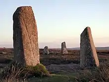 Boskednan stone circle (grid reference SW434351) is a partially restored prehistoric stone circle near Boskednan, around 4 miles (6.4 kilometres) northwest of the town of Penzance in Cornwall, United Kingdom. The megalithic monument is traditionally known as the Nine Maidens or Nine Stones of Boskednan, although the original structure may have contained as many as 22 upright stones around its 69-metre perimeter.