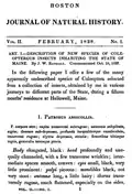 The Boston Journal of Natural History (1834-1863) was a scholarly journal published by the Boston Society of Natural History in mid-19th century Massachusetts. Contributors included Charles T. Jackson, Augustus A. Gould, and others. Each volume featured lithographic illustrations, some in color, drawn/engraved by E.W. Bouvé, B.F. Nutting, A. Sonrel, et al. and printed by Pendleton's Lithography and other firms.[1]