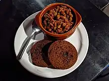 Boston baked beans are a variety of baked beans, sweetened with molasses, and flavored with salt pork or bacon.[1][2][3]