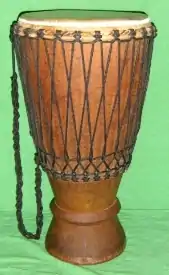 A bougarabou (alternative spelling “Boucarabou”) is a set of drums commonly used in West Africa. The drums are single headed (cow skin), with an elongated goblet[1] or roughly conical shape, usually placed on a single stand, and most commonly played in sets of three to four.