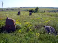 Boundary Stones is an archaeological site in Ukraine since the late Neolithic located in Kropyvnytskyi Raion of Kirovohrad Oblast. Consists of two series of 15 pairs of parallel stone monoliths - alley menhirs. Perhaps this religious building associated with the god of the sun. Rows are oriented from east to west, the height of the parallel pairs of identical blocks. The highest second pair (1.50 m), height should be gradually reduced. The distance between adjacent rows of blocks increases. Qualified archaeological research of the monument was carried out.
