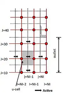The equations are solved for cells up to NI-1, outside the domain values of flow variables are determined by extrapolation from the interior by assuming zero gradients at the outlet plane