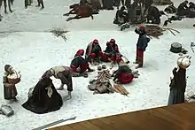 The subject of the painting is the movement of French General Charles-Denis Bourbaki's Armée de l'Est to neutral Switzerland in February 1871, at the end of the Franco-Prussian War. Bourbaki's army had been defeated during the 15–17 January Battle of the Lisaine, whilst unsuccessfully attempting to relieve the Siege of Belfort, so they sought internment in neutral Switzerland. Some 88,000 men marched into Switzerland via Les Verrières, abandoning 11,000 horses, 1,150 wagons, 285 artillery pieces, 7,200 rifles and 64,000 bayonets. The wounded received care from the Swiss Red Cross and local villagers.[1] The interned men were released back to France after six weeks.[2]