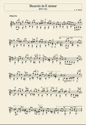 Bourrée in E minor is a popular lute piece, the fifth movement from Suite in E minor BWV 996 (BC L166) written by Johann Sebastian Bach between 1708 and 1717. The piece is arguably one of the most famous among guitarists.[1]