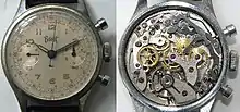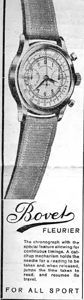 The most commonly used ebauches during this period were those manufactured by Ebauches SA (now ETA, SA),[24] namely the Valjoux and Landeron calibres.[25] The 17 jewel Valjoux 84 lever movement with stem wind was the most common Valjoux movement for the Bovet chronographs,[26] but sometimes the 77 calibre was also used.[27] The Landeron movements were more varied, which included the 47, 48, 51, 57, 59, 80, 81 calibres, and for the rare date and moonphase models,[28] the Landeron 186 was used.[29] Most of the Bovet Freres watches contained Valjoux movements, while most of the Favre-Leuba watches contained Landeron movements. It has been said that the Valjoux were the better produced of the ebauches, indeed the best at the time, and that over time the Landeron became more common and cheap in quality, and it is said that the poor quality of the Landeron had a negative impact on the Bovet name.[30] These chronographs were produced in large numbers, and are fairly commonly found on the internet for purchase. This was a commercial divergence in the Bovet identity which is unique in the Bovet history, as it is normally known for refined artistic pieces, and not utility.[31]