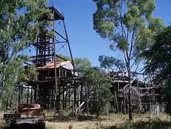 The steel headframe, 24 metres (79 ft) in height and with twin pulleys 3 metres (9.8 ft) in diameter, was purchased second-hand in Charters Towers as was the horizontal twin-cylinder winding engine built by Walkers Limited of Maryborough. The headframe and winding engine were installed on site in c. 1925.[1]