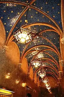 The ceiling above the banking room contains six deep beams, which are actually steel trusses.[11][30] These beams are supported by imitation-stone corbels on the walls, which conceal steel brackets beneath. The ceiling is coated with six layers of materials, giving the impression that it contains coffers and small wooden beams.[30] Six cast-bronze chandeliers are anchored from the ceiling, each of which has three tiers.[29][30] The central lamp was modeled after that of the Hagia Sophia.[11] Originally, the center of the ceiling had a skylight with twelve panels of pale amber glass.[10] The skylight measures 35 by 60 feet (11 by 18 m).[19]