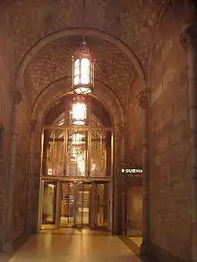 The first floor consists of three sections: an elevator vestibule on the west, a banking room on the center, and the smaller "Chapel" section to the east.[lower-alpha 2] The annex and banking rooms use a mixture of materials on the walls and columns.[24] According to the Landmarks Preservation Commission, these include ashlar as well as "marble, limestone, sandstone, imitation stone, and plaster".[25] Valuables were stored in a bank vault in the basement, measuring 9 feet 8 inches (2.95 m) wide and 36 feet (11 m) deep.[26] The York Safe and Lock Company built a rectangular steel vault door measuring 36 inches (910 mm) thick.[27]