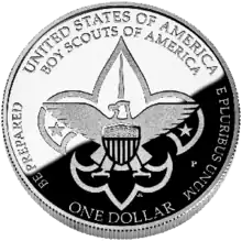 DesignFeatures the Boy Scouts of America's universal emblem. Inscriptions: BOY SCOUTS OF AMERICA, BE PREPARED, E PLURIBUS UNUM and ONE DOLLAR.