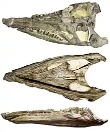A larger specimen (FHSM VP-321 - skull length 170 cm) was collected by George Fryer Sternberg in 1952 from the Fairport Chalk of Russell County, Kansas, and later described by Carpenter.[9] Schumacher and Everhart (2005) reported on the age and locality of both Kansas specimens.[10] This specimen is now reassigned to its own genus and species, Megacephalosaurus eulerti.[7]