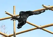 Brachiation (from "brachium", Latin for "arm"), or arm swinging, is a form of arboreal locomotion in which primates swing from tree limb to tree limb using only their arms. During brachiation, the body is alternately supported under each forelimb. This form of locomotion is the primary means of locomotion for the small gibbons and siamangs of southeast Asia. Gibbons in particular use brachiation for as much as 80% of their locomotor activities.[1] Some New World monkeys, such as spider monkeys and muriquis, were initially classified as semibrachiators and move through the trees with a combination of leaping and brachiation. Some New World species also practice suspensory behaviors by using their prehensile tail, which acts as a fifth grasping hand.[2] Evidence has shown that the extinct ape Proconsul from the Miocene of East Africa developed an early form of suspensory behaviour, and was therefore referred to as a probrachiator.[3]