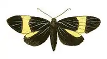 Antennae black and setaceous. Thorax and abdomen nearly black. Wings deep brown, nearly black; the anterior having a yellow band crossing them from the anterior edges to the lower corners; and the posterior having a broad yellow streak on the anterior edges. Margins of the wings entire. Wingspan 2+3⁄4 inches (70 mm).[1]