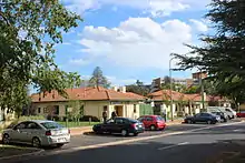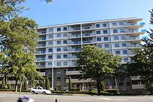 The three-storey Allawah Court flats (containing 114 two-bedroom flats) were completed east of Cooyong street and north of Ainslie Avenue in 1956, the three-storey Bega Court was completed south of Ainslie Avenue in Reid in 1957 and the eight-storey Currong Apartments (184 one-bedroom flats and 28 of two bedrooms) were completed east of Allawah Court and west of Currong Street in 1959 in order to cope with a critical lack of accommodation for public servants transferred to Canberra. The ACT Heritage Council described them as having been designed in the Post-War International style "similar to post-war housing in Europe, particularly in English new towns. The fine proportions, crisp detailing and low scale of [the Allawah and Bega Courts] and their siting continuing the street pattern made them more architecturally successful than the three eight-storey blocks of flats along Currong Street which completed the development." The Heritage Council declined to heritage list the buildings[19] and despite some local opposition it was proposed that they be demolished and replaced by more modern and denser accommodation along with some commercial uses.[16][20] The demolition was completed in August 2017.