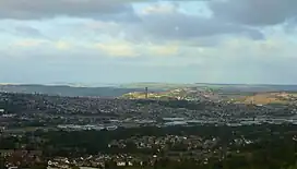 ![]() An image looking north eastwards across Bradford and Bradford Dale. The dale extends across the middle foreground from left to right (where the warehouses are) and then changes direction to go back to the left around Manningham Mills (the very tall chimney in the middle). The steep sides of Airedale are the hillsides in the distance | |