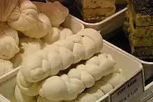 Braided cheese is a dairy product made from strips of highly elastic cheese wound together in a braid.[1] Lebanon, Syria, Turkey, Armenia, Israel, and many Latin American nations make varieties of braided cheese. These cheeses can be used in a variety of dishes or eaten plain. Some varieties benefit from a soak in cold water, to soften the cheese, and to remove excess salt.[2]