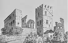 Surrounding the tower on the east and west are a residential wing and the remains of the old part of the castle. North of the tower is a semi-circular part of the old ring wall. South of the tower is a courtyard and the new castle which was built in the 15th century under the Toggenburg counts.[3]