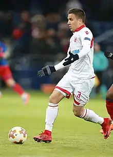 On 8 July 2017, Jovičić signed a three-year contract with Serbian side Red Star Belgrade.[5] He made his debut for new club in first leg of the second qualifying round for 2017–18 UEFA Europa League, in a 1–1 draw against Irtysh Pavlodar.[6] Jovičić was elected for the player of the match in 2–0 win against the same rival, in the second leg.[7] Jovičić suffered a metatarsal bone fracture after a bad tackle by Nikola Drinčić during the match against Čukarički on 6 August 2017.[8] On 29 November 2017, Jovičić scored his first goal for Red Star in a 5–0 victory over Radnik Surdulica after taking a penalty kick.[9] The following season, Jovičić helped Red Star qualify to the group stage of the UEFA Champions League for the first time in club history. Jovičić started in three matches, while coming in as a substitution in two. Later that season, he helped Red Star reach the final of the Serbian cup and win the league title for a second season in a row. The following season, Jovičić would once again show why he had a place in Milojević's team. Unfortunately for him, an injury in the return leg in the second round against HJK Helsinki would see him on the sidelines for up to February 2020.