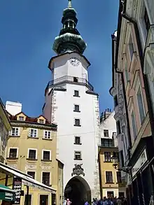 Today, only Michael's Gate, a short stretch of former wall by it and a section by St. Martin's Cathedral approximately 200 metres in length have survived.[6][7] The section by St. Martin's Cathedral was renovated after a massive demolition in the area under the castle due to the construction of an access road to the Nový Most bridge, and parts of fortifications were uncovered.[8] The narrowest house in Europe is located on Michalská Street, near the Michael's Gate.[9]