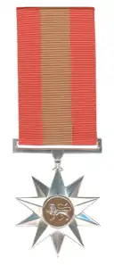 The Bravery Star in Silver, post-nominal letters BSS, was instituted by the President of South Africa in April 1996. It is the middle award of a set of three decorations for bravery, along with the Gold Star for Bravery and the Star for Conspicuous Leadership.[1][2]