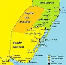 By 1 February 1775, the squadron had already reached Santa Catarina, with Santo António e São José serving as its flagship. The following year, on 6 February 1776, at 15:00, Santo António e São José sailed from Santa Catarina towards Rio Grande do Sul accompanied by nine vessels: two frigates, two corvettes, three smacks, a brig and a sloop. Part of the Santa Catarina Regiment embarked on these ships, this regiment was known as Barriga Verde, "Green Belly". The squadron reached its destination on February 14, anchoring away from the coast. The next day chief MacDuall went ashore in order to meet with the Army Commander in Operations.[8]