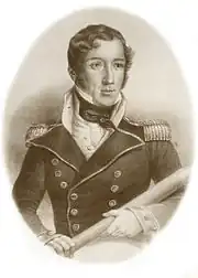 On 3 April 1823, Pedro I departed from Guanabara Bay. Its commander was frigate captain Thomaz Sackville Crosbie. Crosbie's staff included admiral Cochrane, secretary and first lieutenant Victor Santiago Subrá, captain lieutenant John Pascoe Grenfell, first lieutenant William Eyre, second lieutenant William Parker, midshipman Pedro Paulo Boutrolle, commissar José Cristóvão Salgado, chaplain Marista Augusto de Santa Rita and scrivener Manoel Fernandes Pinto.[16] Soon after, however, Cochrane wrote to José Bonifácio de Andrada detailing the poor condition of the ships, remarking that Pedro I was the only ship that could attack an enemy warship or operate against superior enemy forces despite also being in poor condition.[18]