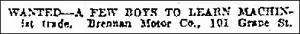 ![]() A 1905 advertisement for a Brennan Motor Co. |
