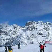 Most of the lifts and ski slopes are located on the shouldering mountains Doss del Sabion and Monte Spinale. There is however a long modern high capacity lift that goes from Madonna del Campiglio right up the main chain of the Brenta Group to Passo Grostè at 2444 meters. In all, the Ski Area Campiglio Dolomiti di Brenta-Val di Sole-Val Rendena can offer around 150 km of piste on 98 ski slopes of all difficulty grades, facilitated by 63 lifts. On the east side of the Brenta Group the ski slopes are located on the Paganella. The Paganella Ski Area can offer around 50 km of piste, facilitated by 16 lifts. The skiing area above Molveno at Pradel is very small but offers a splendid view into the central part of the Brenta Group.
