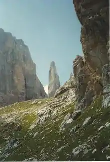 Important explorative and descriptive work was done by Alfred von Radio-Radiis[14] and Hanns Barth.[15] German speaking alpinists like Gottfried Merzbacher, Steck, Mayr, Adang, Heinemann[16] and others left their mark on the Brenta Dolomites. Around the turn of the century a competitive spirit developed between Italian and German speaking alpinists, which took its main inspiration from the emerging nationalistic feelings in the region. Besides that, the explorative character of alpinism gave way to the ascent of rock climbing as a sport. The completion of the Italian unification in 1870 triggered expectations in Italian speaking Tyrol. The spirit of Irredentismo was increasingly present among the local alpinists, who had founded in 1872 their own Società degli Alpinisti Tridentini. In 1882 they constructed the first mountain hut located within the Brenta Group, close to Bocca di Brenta: Rifugio Tosa, at 2439 m. Local Alpinists like Carlo and Giuseppe Garbari and Nino Pooli, started to follow in the tracks of the local guides Matteo & Bonifacio Nicolussi and Antonio Dallagiacomo, who had led all the foreigners to the summits. The antagonism with the Germanic climbers was exacerbated by an alleged practice of piggybacking on Italic efforts. The DÖAV Sektion Bremen decided to construct a large mountain hut at the rocky saddle just above the Rifugio Tosa in 1897.[17] A similar situation was created at Passo Tuckett where the SAT had constructed the small rifugio Sella in 1905 and the DÖAV Sektion Berlin built a larger hut right next to it.[18] When the last undisturbed major peak in the Brenta Group, Campanile Basso, was finally climbed by Berger and Ampferer in 1899, it appeared that they had heavily relied on the work of Garbari and Pooli, who had stopped just 35 meters off the summit.[19] During the First World War the Brenta Group remained undisturbed by warfare and it is fair to conclude that after Trentino became allocated to Italy at the Treaty of Saint-Germain-en-Laye, the exploration of the Brenta Group had been largely completed. The era of sports climbing had begun and innumerable climbing routes in all possible difficulty rates were traced on the vertical walls of these mountains over the years.