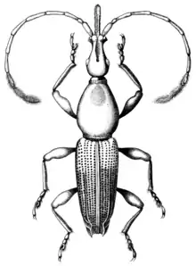 Brentidae, sometimes known as the primitive weevils, is a cosmopolitan family of primarily xylophagous beetles also known as straight-snouted weevils. The concept of this family has been expanded with the inclusion of three groups formerly placed in the Curculionidae; the subfamilies Apioninae, Cyladinae, and Nanophyinae, as well as the Ithycerinae, previously considered a separate family. They are most diverse in the tropics, but occur throughout the temperate regions of the world. They are among the families of weevils that have non-elbowed antennae, and tend to be elongate and flattened, though there are numerous exceptions.