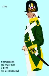 On 1 April 1791, provisional regulations were announced following the initial stages of the French Revolution, and the regiment renamed as the 6th Battalion of Chasseurs (Bretons) (6ème Bataillon de Chasseurs (Bretons)), but they continued to be known as their former title until 1792. In addition to the new title, the regiment adopted a new uniform; peak casque, with stiff black horsehair crest and mock leopard skin turban casque, yellow turnbacks, dark green jacket, dark green breeches, dark green gaiters, black boots, dark green pockets, yellow trimmed dark green pockets, yellow trimmed dark green cuffs, yellow cuff flaps, and white buttons.[5][6][8][3][16]
