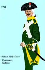 The Chasseurs Bretons were formed on 1 May 1788 in Lorient, Brittany from the four infantry companies of the Chasseurs à Cheval des Alpes. The new battalion was 6th in precedence, just after the Cantabres Chasseurs and before the Auvergne Chasseurs. The regimental staff or État-Major was composed of the following: 1 lieutenant colonel (commander), 1 major, 1 quartermaster-treasurer, 1 adjutant, 1 surgeon-major, music section (1 drum major and 4 musicians), 1 master tailor, 1 master armourer, and 1 master cobbler. Each company was decreed to be organised as follows: 1 captain commandant, 1 second captain, 1 first lieutenant, 1 second lieutenant, 2 port drapeaus (literally flag holders), 1 sergeant major, 1 corporal fourrier, 4 sergeants, 8 corporals, 8 appointés, 78 chasseurs (12 riflemen), and 2 drummers. This left a total of 108 troops, not including the two attached officers or officer cadets assigned. The battalion was also divided into five companies (four field), while the last (fifth) remained at the regimental depot as a recruitment and training unit.[2][4][5][6][7][8][9][10][11]