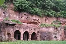 Among the wealth of architectural witnesses to Bretzenheim's history, the Felseneremitage (or simply Eremitage, meaning “Hermitage”; Felsen means “cliff”), a place of worship wholly hewn out of a cliff that might even date from antiquity, and that underwent a conversion in early Christian times, is held to be the greatest sightseeing feature, and to be unique north of the Alps. It is believed that its origins lie in a prehistoric place of worship or tribunal site, and that the Romans took over the site in that same function. Its Christian character was supposedly acquired by the 6th or 7th century, even if the first documentary mention of a church there dates from 1043. This and all subsequent churches were partly made of chambers hewn into the cliff, and their remnants can still be seen today. The same is so for the rooms that served as hermits’ cells or a monastic convent, which were wholly hewn out of the stone. The one such dwelling that can still be visited now (90 m²) was for a time home to several hermits or a convent of a cliffside monastery. The last dwellers, between 1716 and 1827, were hermits, who after a long vacancy had once again created here a pilgrimage place known far beyond the borders. The last hermit died in 1827, after 51 “years of service” at the age of 82. The complex can be visited throughout the year without the need of a guided tour.[13][14]