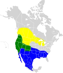 These birds are often permanent residents in the west. Other birds migrate to the Southeastern United States and Mexico in Spring. The range of this bird has been expanding east in the Great Lakes region.[7][5] They've expanded their habitat as recently as the 20th century.[5]