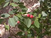 Breynia oblongifolia, commonly known as coffee bush, grows naturally in Australia and New Guinea as shrubs up to 3 m (10 ft) in height. The species produces alternate, distichous, ovate leaves 20–30 mm (0.8–1.2 in) long by 10–20 mm (0.4–0.8 in) wide.[2] Small, green flowers are produced in spring and summer, and these are followed by orange or pink berries about 6 mm (0.24 in) diameter that turn black when fully ripe.