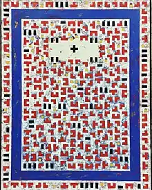 His practice in architectural and autonomous stained glass, often on a monumental scale,[12] has led to successive innovation and invention in the development of the medium.[lower-alpha 2] This includes the creation of stained glass without lead and the subsequent pioneering of a 'dramatically enhanced Pointillism'[15] in glass, as well as the creation of sculptural stained glass works, analogous to collage, made primarily or entirely of lead. The latter two advances are described as having taken stained glass as an art form to its zero-point in each direction: absolute transparency and complete opacity.[lower-alpha 3]