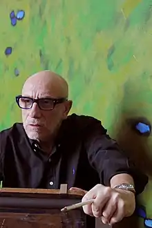 Born to a working-class family in Oldham, in the north of England, and a full-time art student on scholarship by age 13, Clarke came to prominence in the late 1970s as a painter and figure of the Punk movement[5][6][7] and designer of stained glass. By the early 1980s he had become a major figure in international contemporary art,[8] the subject of several television documentaries and a café society regular. He is known for his architectonic art, prolific output in various media,[9] friendships with key cultural figures,[10][11][lower-alpha 1] and polemical lectures and interviews.