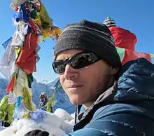 Brian Dickinson (born June 16, 1974) is a climber who soloed the summit of Mount Everest on May 15, 2011,[1] after his Sherpa mountain guide became ill and went back down to high camp (South Col, 26,000'). After taking some pictures and making a radio call, Brian began his descent, but within a few feet, he became snow blind. His vision did not fully return for over a month. His descent to high camp from the summit took over seven hours instead of the expected two to three hours. Brian ran out of oxygen on his descent but made it down to the South Col, where his guide met him to help him back to his tent. Brian holds the record for the highest solo blind descent.[2][3]