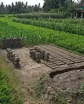 The ingredients are first harvested and added together, with clay content ranging from 30% to 70%.[35] The mixture is broken up with hoes or adzes, and stirred with water to form a homogenous blend. Next, the tempers and binding agents are added in a ratio, roughly one part straw to five parts earth to reduce weight and reinforce the brick by helping reduce shrinkage.[36] However, additional clay could be added to reduce the need for straw, which would prevent the likelihood of insects deteriorating the organic material of the bricks, subsequently weakening the structure. These ingredients are thoroughly mixed together by hand or by treading and are then left to ferment for about a day.[33]