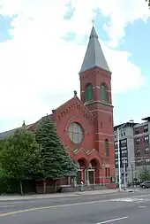 Railroad service through East Orange began with the opening of the Morris and Essex Railroad on November 19, 1836 to Orange. The railroad stopped at the residence of local attorney Matthias Ogden Halsted each day for him to commute. He soon provided a station for commuters to use as well as himself, and hired a family to operate it, without charging the railroad. Locals helped fund and build a new depot in 1880.[2] The current station opened on December 18, 1922 when the railroad tracks through the city were elevated by the Delaware, Lackawanna and Western Railroad. The brick headhouse at Brick Church station were added to the New Jersey and National Registers of Historic Places in 1984 as part of the Operating Passenger Railroad Stations Thematic Resource.[8][9]