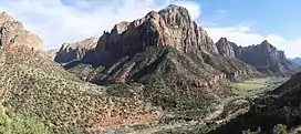 Bridge Mountain is located east of the park headquarters near the south entrance to Zion Canyon. Bridge Mountain was once originally named Crawford Mountain after the Crawford family who were early Mormon settlers in the canyon. But the name was officially changed to Bridge Mountain in 1934 when a natural bridge was discovered on Bridge Mountain. However, it was not a bridge, but a natural arch. For years, rangers in Zion Park told visitors that this was a natural bridge, hence the mountain's name.[4] A bridge is defined as a subtype of arch that is primarily water-formed. To avoid confusion, the National Park Service eventually named the span Crawford Arch. Precipitation runoff from the mountain drains into tributaries of the North Fork Virgin River. This mountain is composed of Navajo Sandstone, with a red shale outcropping of the Kayenta Formation exposed along the lower slopes.
