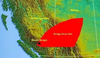 The Bridge River Ash is a large geologically recent volcanic ash deposit that spans from southwestern British Columbia to central Alberta, Canada. The ash consists of dust-sized shards ellipsoidal fragments of pumice. It overlaps the Mount St. Helens Yn Ash and the Mazama Ash which were erupted from Mount St. Helens and Mount Mazama about 3,400 and 6,800 years ago.
