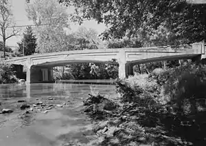 The Bridge in West Earl Township, as it is designated on the National Register of Historic Places, is also known by its historic name, Big Conestoga Creek Bridge No. 12. It carries Farmersville Road (unsigned SR 1010) across the Conestoga River at Brownstown, West Earl Township, Pennsylvania, in the United States. The bridge is notable for its form, a three-span, continuous, arched concrete girder that does not touch the abutments. Designer Frank H. Shaw was a consulting engineer to Lancaster County when the bridge was constructed in 1917, but appointed county engineer that same year.[2] The bridge was replaced with a new three-span structure in 2019.[3] It is now known as the Sergeant Melvin R. Wink Memorial Bridge.