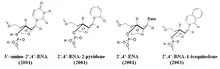 Chemical structures of BNA monomers containing a bridge at the 2', 4'-position of the ribose to afford a 2', 4'-BNA monomer as synthesized by Takeshi Imanishi's group.[2][3][4][5][6][7] The nature of the bridge can vary for different types of monomers. The 3D structures for A-RNA and B-DNA were used as a template for the design of the BNA monomers. The goal for the design was to find derivatives that possess high binding affinities with complementary RNA and/or DNA strands.