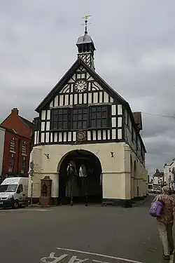 A new town hall was constructed in the High Street by taking an old oak framed tithe barn that had been donated by Lady Bertie, the wife of Sir Roger Bertie, the lord of the manor at Much Wenlock, and placing it on arches in 1652.[1][4] The arches on the ground floor were left open to allow markets to be held; at both the north and south ends of the building there were single arches large enough to permit carriage access with the town's coat of arms installed above.[5] There was a three-part window on the first floor at each end with a gable and a turret at roof level.[1] A sign on the wall above the window at the south end suggests the building was constructed by a Thomas Burne and a Roger Taylor.[6] Internally, the principal rooms on the first floor were a council chamber and a courtroom.[7] The clock in the gable at the south end was installed in 1680 while the clock at the north end was installed at a later date.[8]