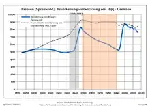 Development of Population since 1875 within the Current Boundaries (Blue Line: Population; Dotted Line: Comparison to Population Development of Brandenburg state; Grey Background: Time of Nazi rule; Red Background: Time of Communist rule)